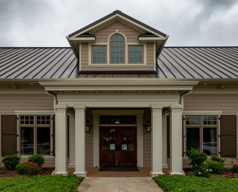 First Southern Bank in St. Florian, AL is located at and angled toward the intersection of Old Jackson Highway and St. Florian Road. Offices, tellers, and a post room are organized around a central teller lobby, and a drive-through with three lanes and a night deposit box is at the rear of the building. The exterior is traditional in style and has a neutral color palette of warm grays. Lap siding, square columns, and rounded windows complete the traditional look.