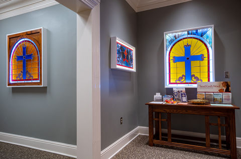The exterior is constructed of brick and limestone with large expanses of gothic-shaped window walls. The interior features a spacious wrap-around fellowship lobby with a welcome center for guests. The organ and pipes removed from the demolished sanctuary were refurbished, and the pipes are now exposed on either side of the baptistry. The worship center includes state-of-the-art sound, video, and theatrical lighting to enhance the worship experience and was shaped for optimal acoustical performance with the assistance of an acoustical consultant. The altar area features a handcrafted, budded cross with a window behind it, allowing daylight to shine from behind the cross. This area is flanked by two electric-operated video screens that retract into the ceiling above.